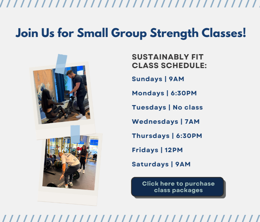 Our small group Sustainably Fit classes bring together certified coaches and a supportive fitness community that keeps you motivated every step of the way. You’ll move better, build confidence, and stay consistent — because here, you’re never training alone.